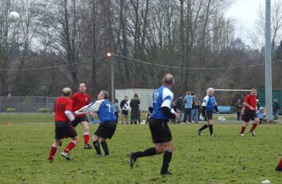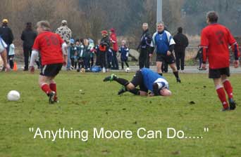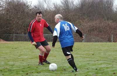 A trip to Beach Grove is always a daunting task for the Classics but they were assured that the pitch was playable if everybody stomped the tyre tracks down, kindly left after some idiot was testing his four-wheel drive out on the field before the game. Where are Chuck's boots when you need them? He could have done it on his own in less than a minute. The game began with the Classics having the better of the early pressure and they deservedly took the lead in the seventh minute from a free kick on the edge of the area. Chris Arcari set the ball down and was looking to do a "Dave Moore" but an encroaching player put paid to that little plan. However, Danny Jensen, obviously enlightened by the devious proceedings, ran up and smacked his kick low through the wall and into the net, albeit off the keepers gloves. It was a shot learned from the master.