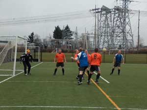 Three minutes later the Pioneers were level after a Graham Mason right sided effort was well placed to the left of the keeper and the ball rolled just inside the post. The Classics took the lead again in the 22nd. minute when a right wing corner from Mike Snow was hammered home by Bruce Cook, returning from International duty in Mexico. The rocket left his boot and was perfectly placed in the top right angle of the goals. It was a stunning goal! Five minutes later the Pioneers were level yet again. This time Kenny Johnson did the damage when he headed the ball downwards to beat Soucker. Something was definitely wrong - Johnson never scores against the Classics!