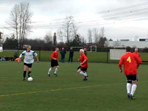 The Classics went on the attack straight from the kick off and peppered the Britannia defence in a non stop barrage like heat seeking missiles. The offensive play paid early dividends for the home side. In the 7th. minute a beautiful left wing centre from Jim Eden landed perfectly on Bruce Cook's head. Only one yard out from goal, these headers are bread and butter to the experienced Cook and he made no mistake as he powered the ball home to give the Classics an early deserved lead. The goal was Cook's 128th. for the club, ironically equalling provider Eden's tally. There's no selfishness on this team!
