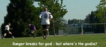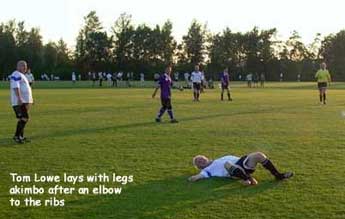 After the game a disgruntled Smith promised, “I’ll have to bring my white boots out nest week and show you some skill.” The white boots should look very good when they contrast with the yellow flag and the white lining on the touchline. The only remaining question to be answered was, “Was it significant that the only Italian on the team failed to turn up for this game on a day when Italy were eliminated from Euro 2004, or was it a coincidence?”