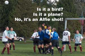 The after game festivities included an excellent Nigerian banquet of peppered goat soup, Nigerian meat pies and lamb curry. The banquet was attended by the unusual site of Chuck McGill who was in the process of test driving a new pair of flotation devices on his feet for Air BC. Gone were the trademark Aladdin shoes. A rare site indeed!