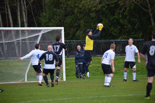The first goal came in the 28th. minute and it was started from a left sided Macklin throw in which was whipped over into the danger area. The ball was in the air a lot and O'Krane hooked his foot up and flicked the ball on, to which the keeper could only hold the ball in slow motion before helping it on it's way over his head and into the net. He immediately ran across to O'Krane to shake his hand for the assist. Peace Arch responded with an attack. Danny Jensen made an uncharacteristic slip and Arch got in a shot, which Judd Boxtart had to save with his extended legs, yet again - I'm sure he's Inspector Gadget in disguise! With 10 minutes of the half remaining a right wing corner from Randy Hosler was headed goalwards by Warren Crowley but was deflected wide for another corner. It was another doosie from Hosler, who was having an impressive game. The ball curled in to the back post and Macklin was on hand to steer the ball over the line with his chest, although Hosler was convinced that it was already over the line. The dubious goals panel decided to award the goal to Macklin cause he's been struggling recently.